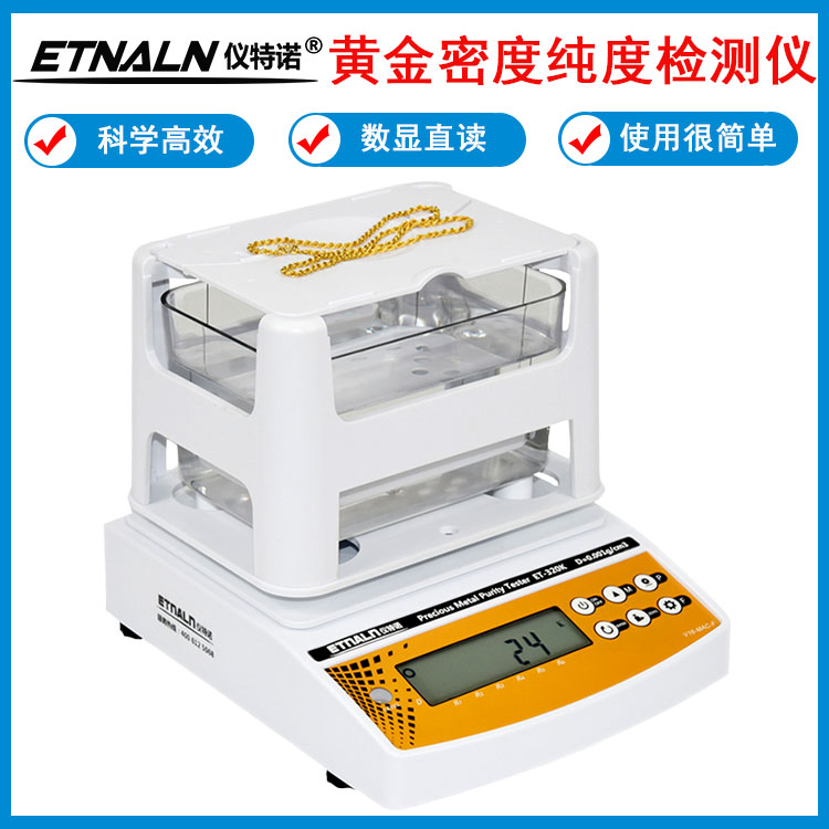 儀特諾黃金密度計_貴金屬純度檢測儀_黃金首飾檢驗真假的儀器ET-320K、ET-600K 、ET-1200K,無需捆綁測試樣品,僅兩個步驟:先測量空氣中重量,按ENTER鍵,再放入水中測水中重量,按ENTER鍵,即可準(zhǔn)確、快速的顯示黃金K值、%含量、密度值;如果是測鉑金,即2步直接顯示鉑金PT值、%含量、密度值;或測銀就直接得出銀S值、%含量、密度值;也可以測量黃金或及其它合金的%含量、密度值。