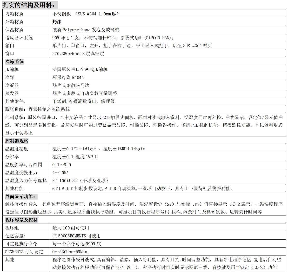 電源線4.0 mm2x3蕊;USB導(dǎo)出端子一個(gè);不銹鋼SUS #304方型沖孔鋼板置物架2片;不銹鋼可調(diào)整間距40mm置物架軌道2組;11W節(jié)能照明窗口燈一支;機(jī)體左側(cè)ψ50mm測(cè)試孔1個(gè)附不銹鋼孔蓋1只,硅膠塞頭1只);標(biāo)準(zhǔn)測(cè)試用不織布1片;控制器使用說(shuō)明書(shū)一套;操作說(shuō)明書(shū)一套。